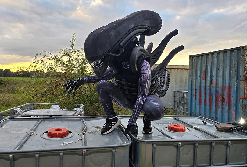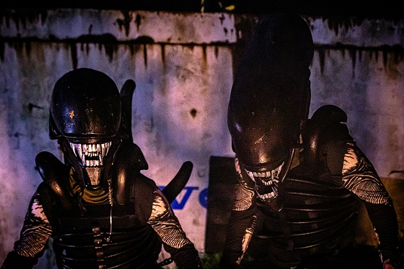For a Halloween event, I created a pair of Alien Xenomorphs out of EVA foam. Each Xenomorph consisted of head, tail, back tubes, claws and a skin suit. In daylight and on close inspection, whilst they had the rough silhouette of a Xenomorph, it was very obviously there was someone dressed up in costume. Not scary in the slightest. I also made a wearable sound FX box and speaker for the Xenos. The night time came (They mostly come at night... mostly), play the hissing and growling sound FXs, and all the onlookers had the living daylights scared out of them! Everyone was totally convince they could have been real Aliens.
