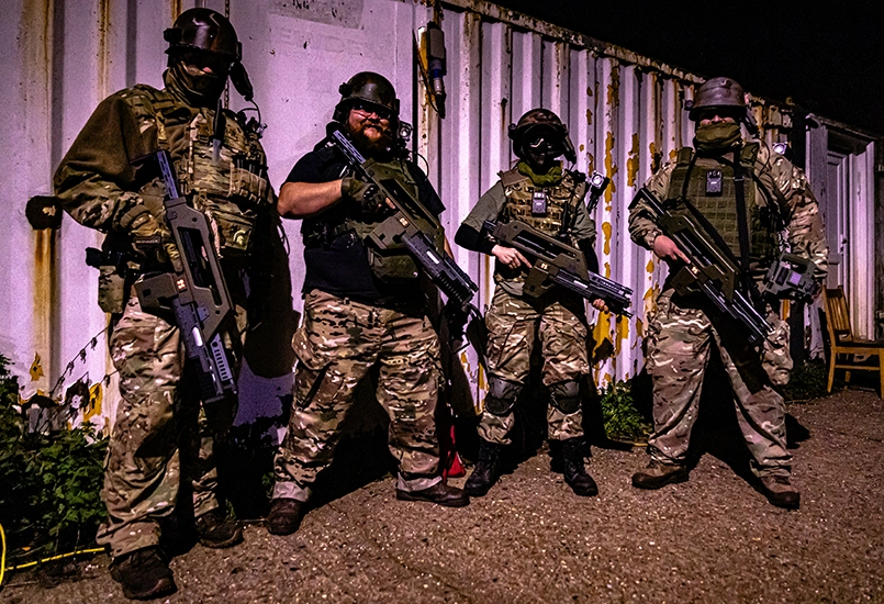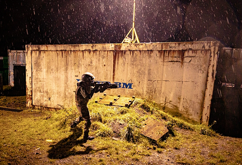 However, the weapons were accurate airsoft replicas of the M41A Pulse Rifles. The helmets had the bump, lobster plates, comms and dummy camera. They all had a working and accurate shoulder lamp. With just these three signature items and a night time evironment, the overall look is convincing enough to be instantly recognisable as a US Colonial Marine from Aliens.