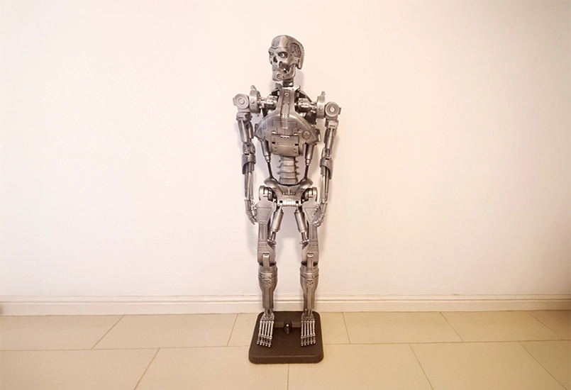 I 3D printed 3 full size T-800 Terminator Endoskeletons for a Halloween event. In daylight and on close inspection, it was clear they were 3D printed. The layer lines were very visible and the paint job just looked silver, not shiny chrome. However, step back 10 metres and the view was slightly different. At a distance they created a convincing and eerie illusion of the Terminator machines.