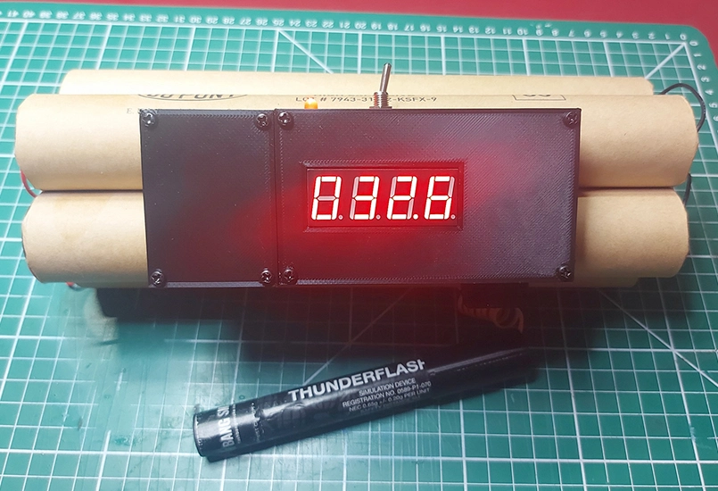 Each unit features a four-digit digital countdown display driven by a microcontroller, starting immediately on activation. Once armed, a fixed sixty-second timer runs uninterrupted, ending in a loud electronic pyro detonation that marks the objective as destroyed. There is no disarm phase, no puzzle, and no ambiguity. The tension comes from visibility, time pressure, and the need to defend the device while the countdown runs.